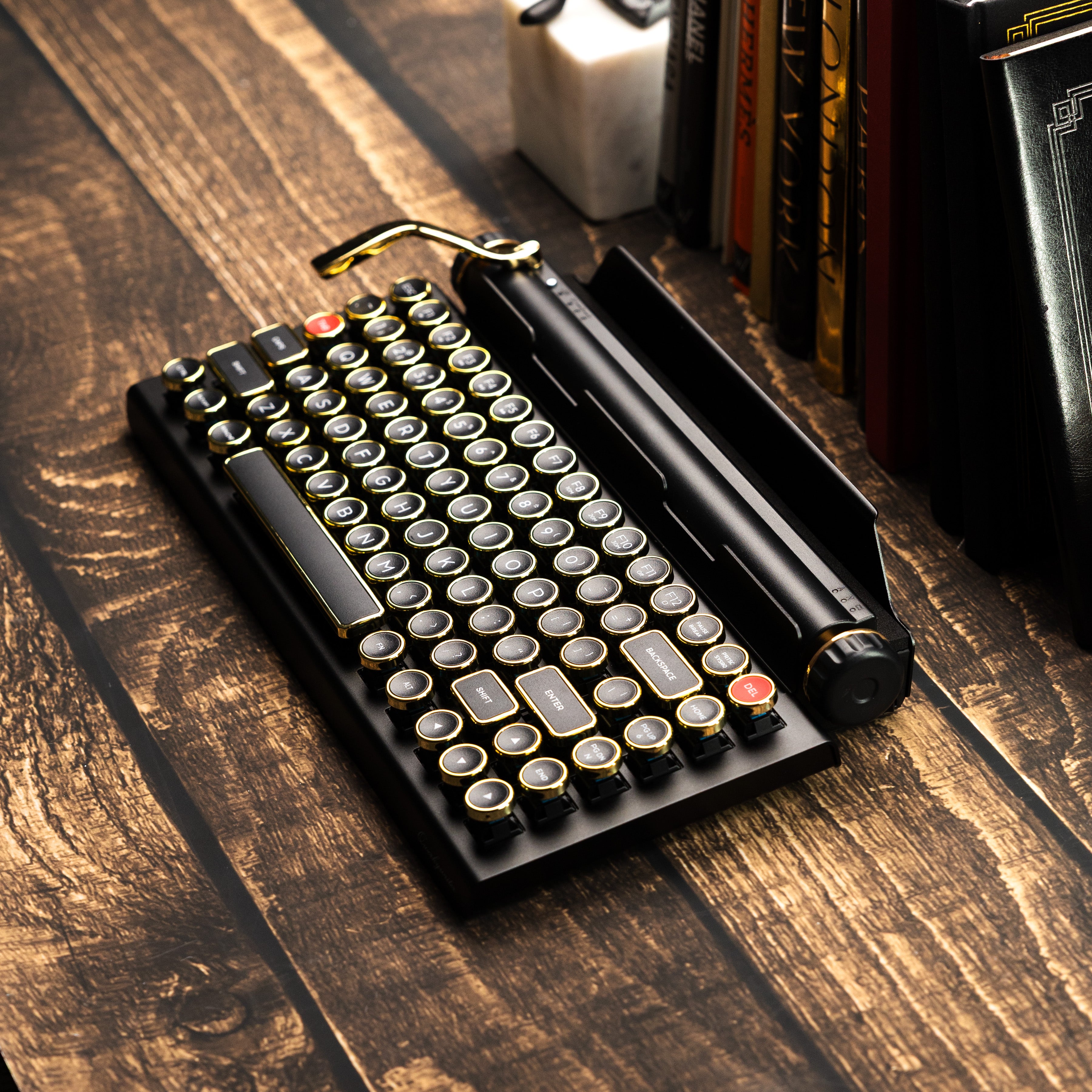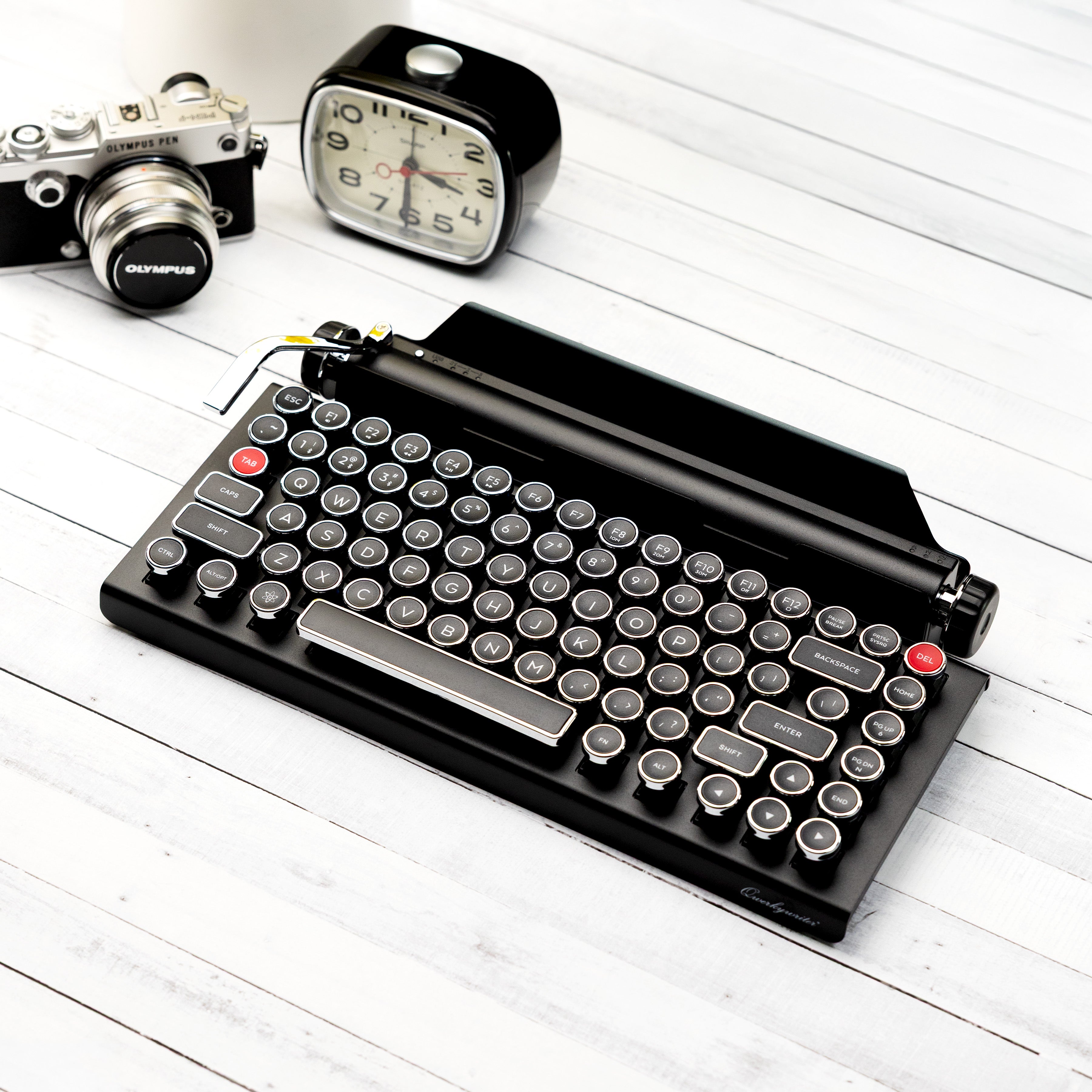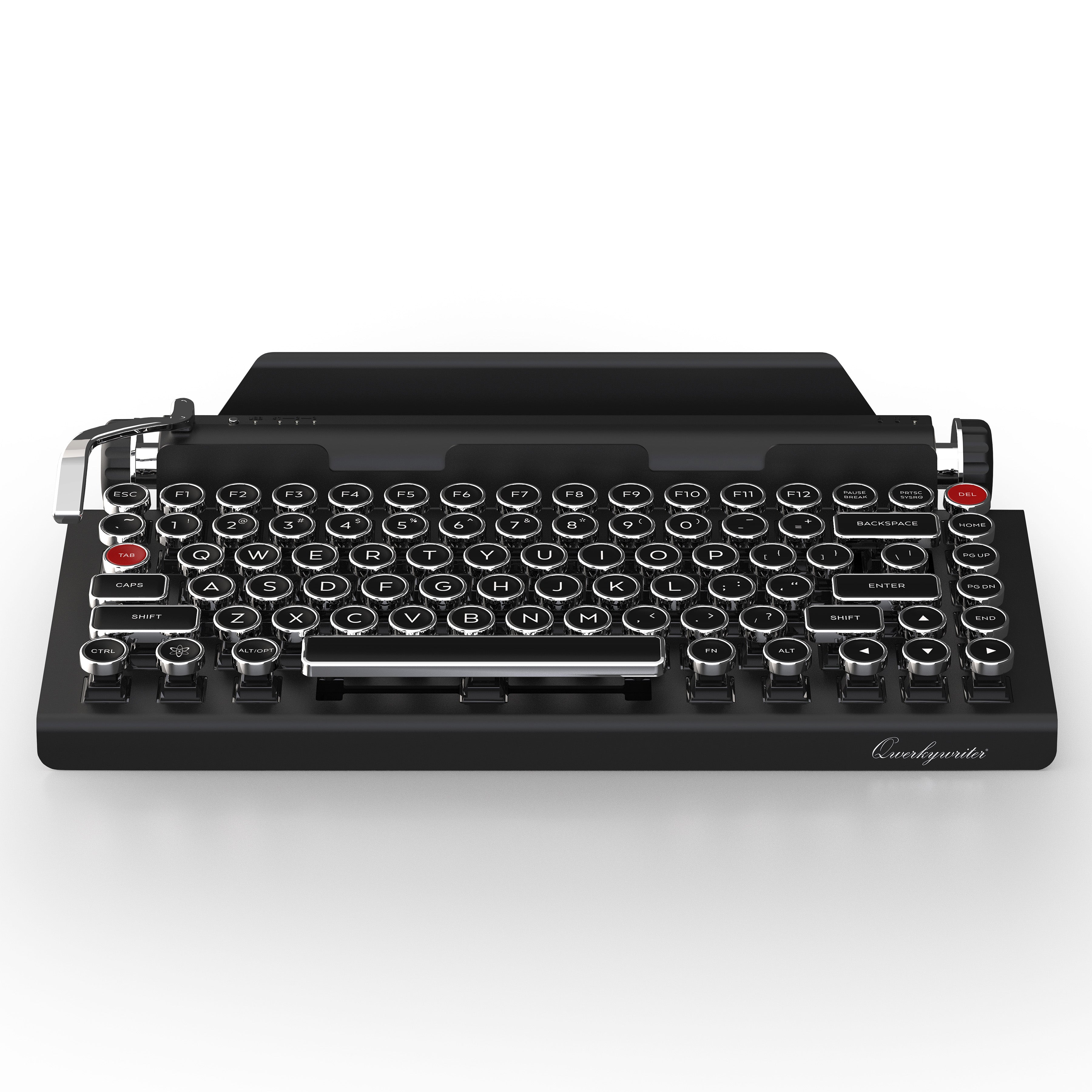 The Qwerkywriter is a modern keyboard designed to look and feel like a vintage typewriter. But unlike old-fashioned typewriters, it connects to your devices using USB-C or Bluetooth 5.0 and works with most computers, tablets, and phones. It also boasts features that no typewriter ever had, like multi-device pairing, media controls, and an integrated tablet stand.