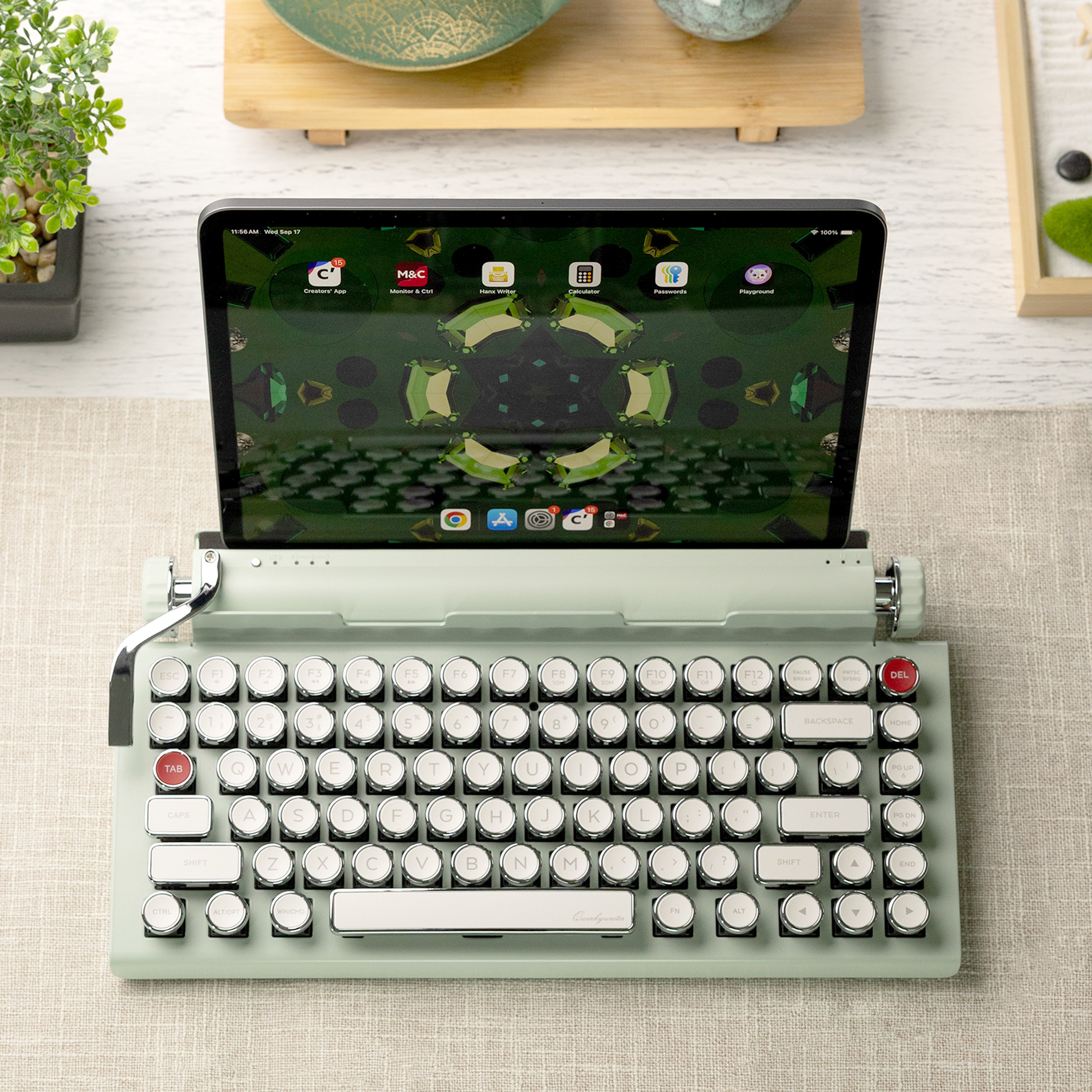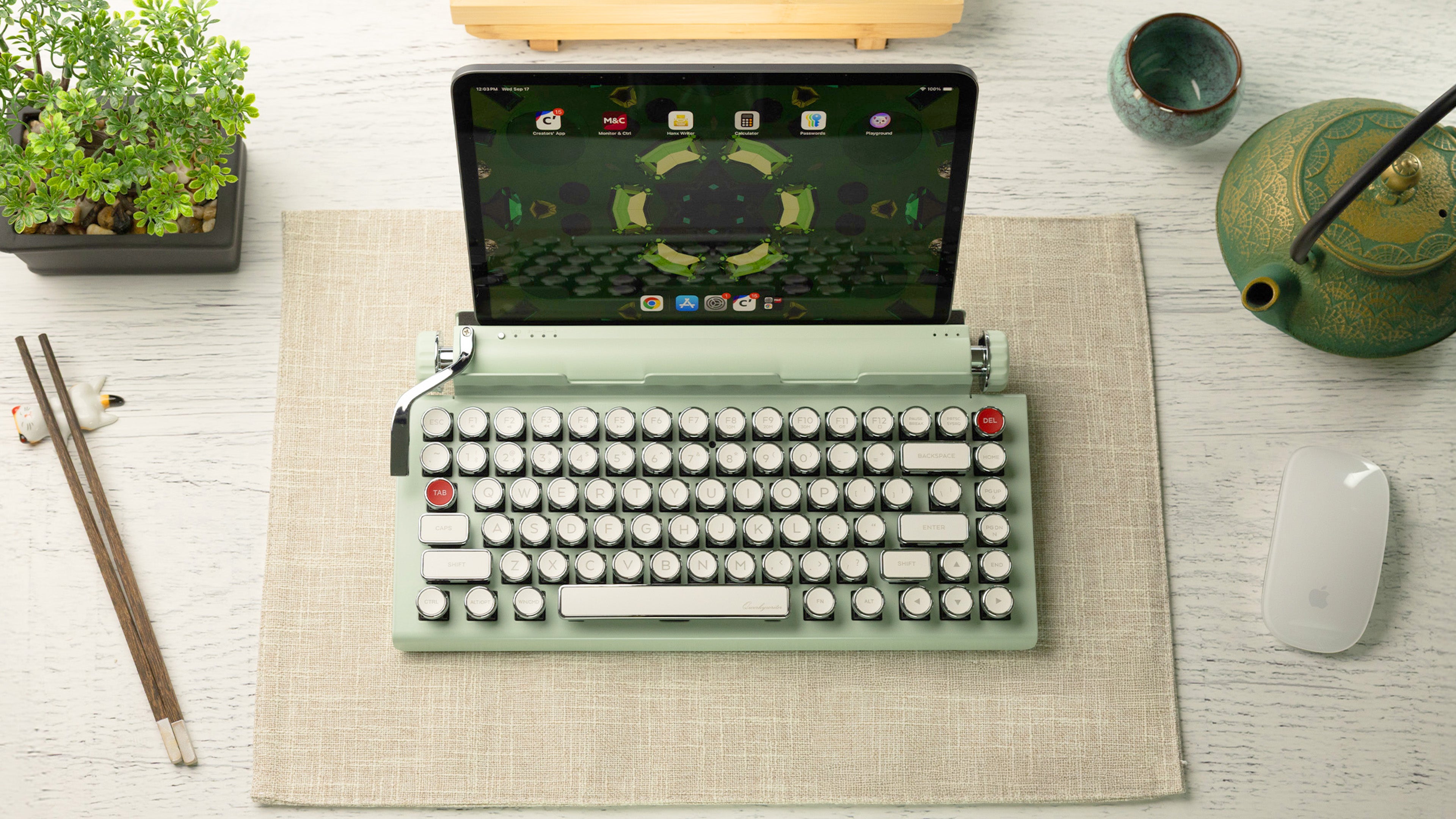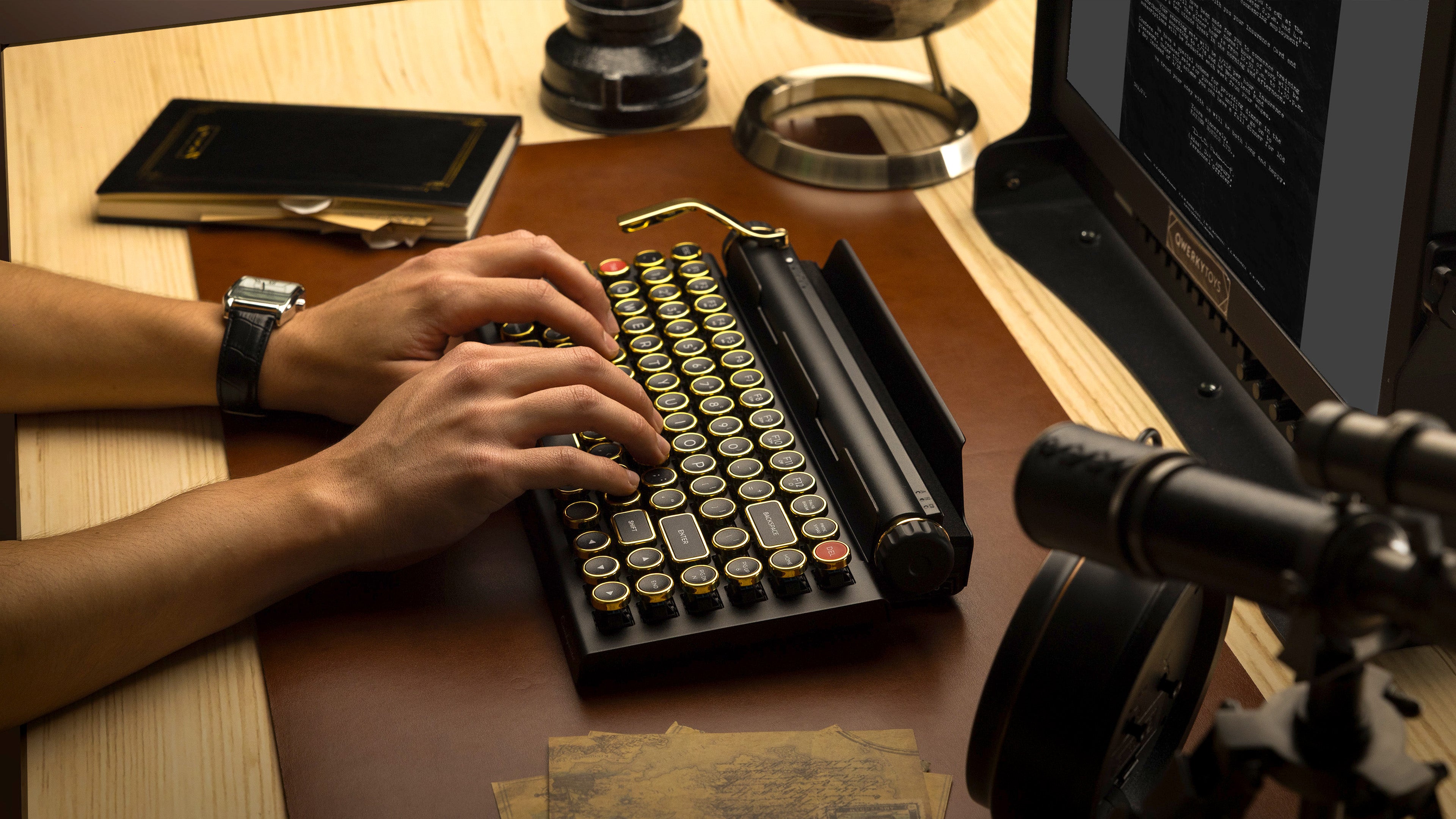 The Qwerkywriter is a modern keyboard designed to look and feel like a vintage typewriter. But unlike old-fashioned typewriters, it connects to your devices using USB-C or Bluetooth 5.0 and works with most computers, tablets, and phones. It also boasts features that no typewriter ever had, like multi-device pairing, media controls, and an integrated tablet stand.